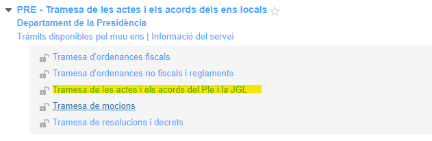 • Escollirem el tràmit: PRE – Tramesa de les actes i els acords dels ens locals > Tramesa de les actes i acords del Ple i la JGL